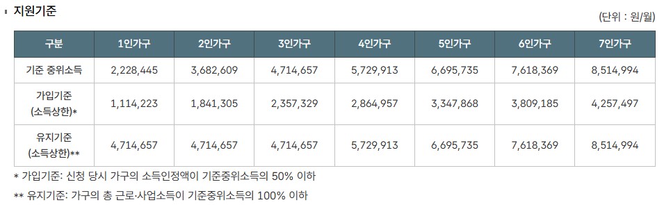 💡 가입 시점에는 중위소득 50% 이하, 유지 기간 동안은 가구 총소득이 중위소득 100% 이하를 넘지 않아야 합니다.